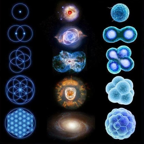The Flower of Life is considered to provide deep spiritual meaning and forms of enlightenment to those who have studied it as sacred geometry, which is pictured above; along with similar images of cell division and our universe.
