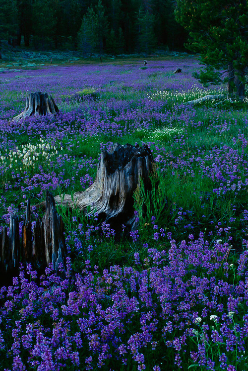 A field of penstemons surround burnt out tree trunks in Tahoe National Forest, Nevada.