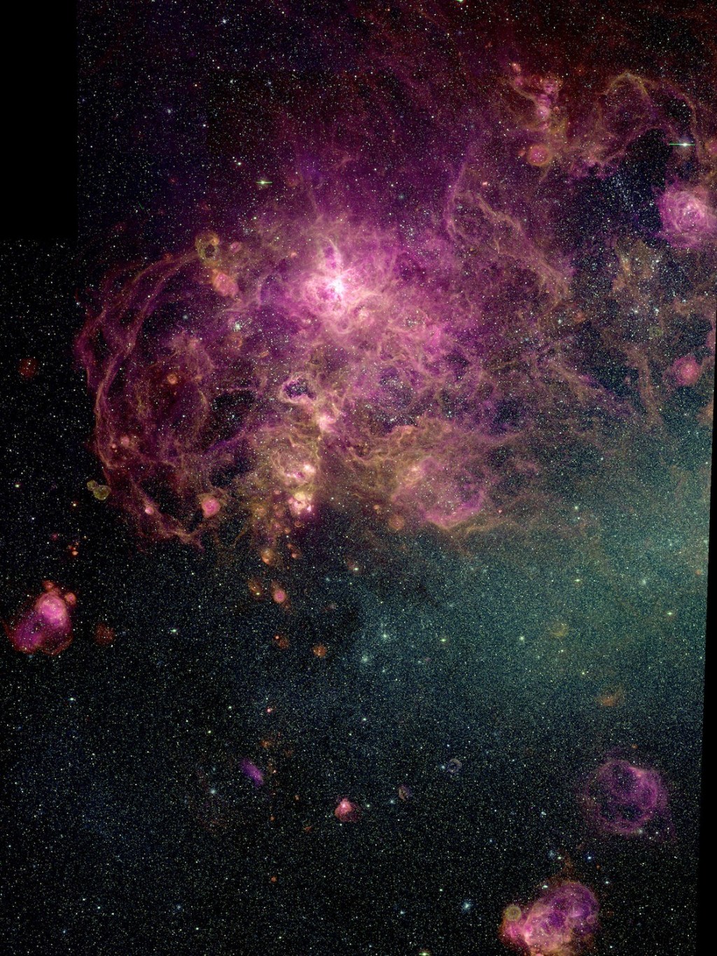 This image of 30 Doradus, the Tarantula Nebula, in the Large Magellanic Cloud (LMC) was taken with the Curtis Schmidt telescope at Cerro Tololo Inter-American Observatory (CTIO) in Chile, as part of the Magellanic Cloud Emission Line Survey (MCELS) project. The Tarantula Nebula is a giant star-forming region, where energy from hot, young stars in the region creates dramatic voids and filaments in the surrounding gas. Located 160,000 light-years distant in the southern constellation Dorado, the LMC is considered the closest large galaxy to Earth. Because of the proximity and low foreground absorption of the LMC, it is an ideal laboratory both for studies of individual HII regions, supernova remnants, and superbubbles, and for investigations of global properties using samples of these objects. MCELS is designed to provide uniform datasets in optical emission lines that are necessary to conduct this research. The MCELS observations toward the 30 Doradus region have been used to investigate the physical properties of the HII region, examine the physical conditions of supernova remnants in the field, and study the large-scale structure of the ionized gas. This color image was produced using three separate exposures taken in hydrogen (red), sulfur (green), and oxygen (blue) filters. Caption: NOAO. Please read Conditions of Use before downloading. S. POINTS, C. SMITH, R. LEITON, C. AGUILERA AND NOAO/AURA/NSF