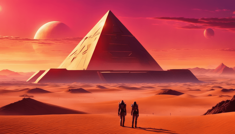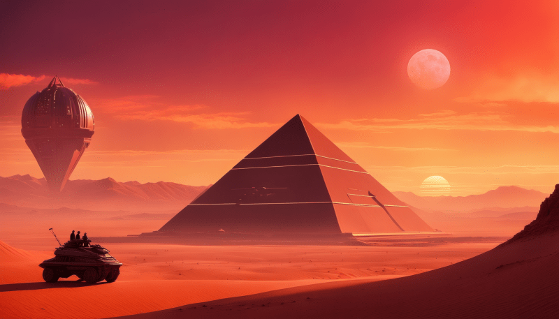 The Prompt: The Mondoshawan, from the movie 5th Element. They can be seen moving away from their alien space ship towards a pyramid. The landscape is sandy, and the sun is hanging low red in the sky. In 300 years, when evil returns, so shall we.